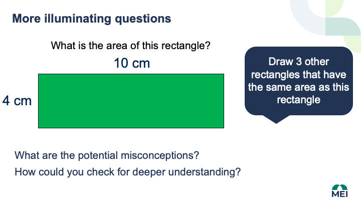 This is an example of a mastery-type questioning approach, where participants look at a traditional skills and knowledge question. They then explore a questioning technique that encompasses reasoning and deeper understanding, and unearths common misconceptions by developing more illuminating questions, such as the one in the picture.